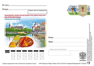 На почтовой карточке с оригинальной маркой изображены: официальная эмблема Чемпионата мира по футболу FIFA 2018 в России™, игровой момент матча, а также архитектурные достопримечательности города-организатора.