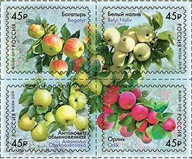 На почтовых марках изображены сорта яблони: Богатырь, Белый налив, Антоновка обыкновенная, Орлик.